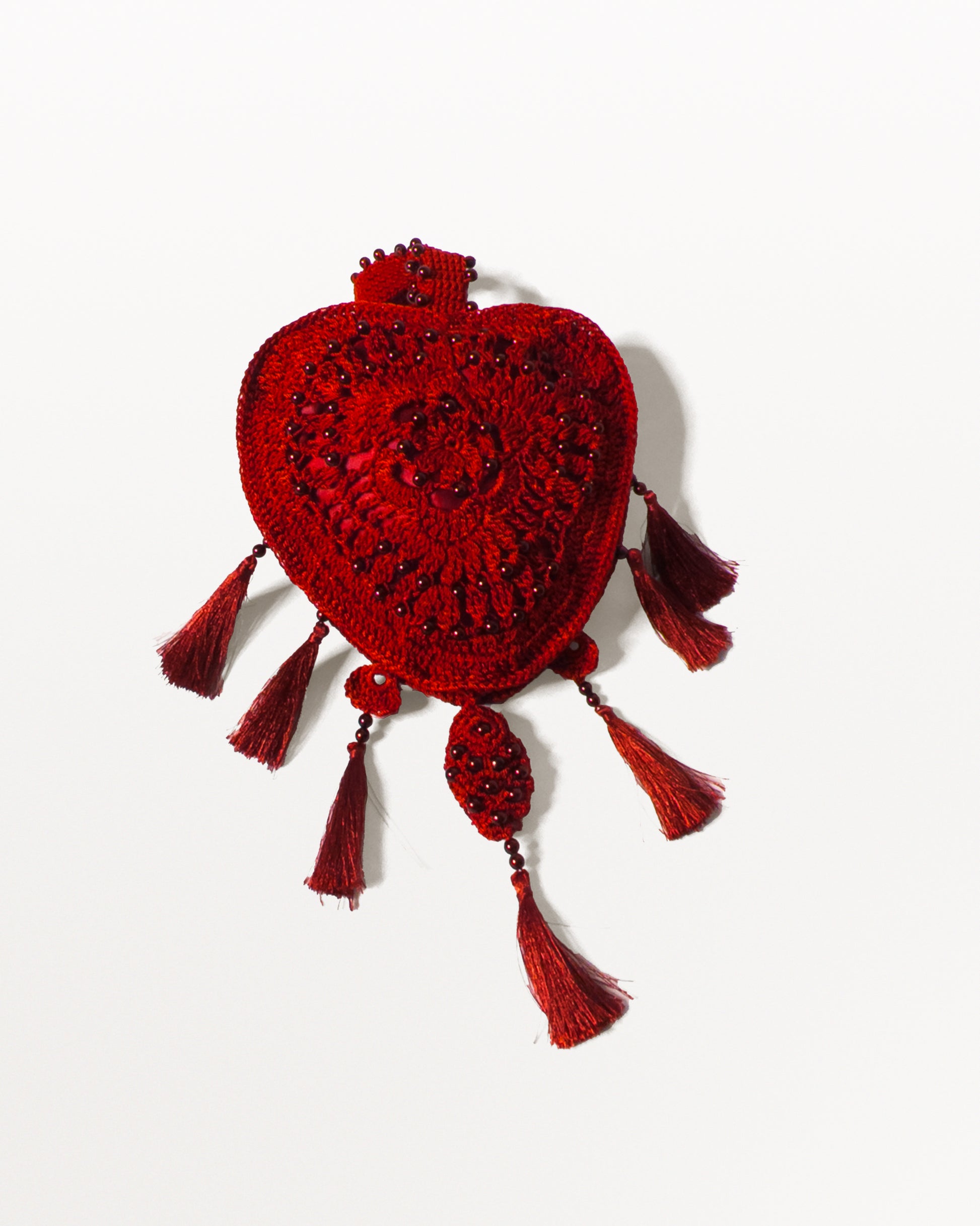 - Heart-shaped crochet bag inspired by the playing card heart icon