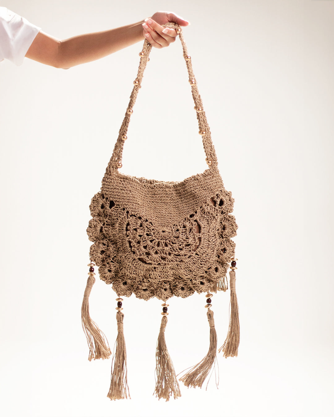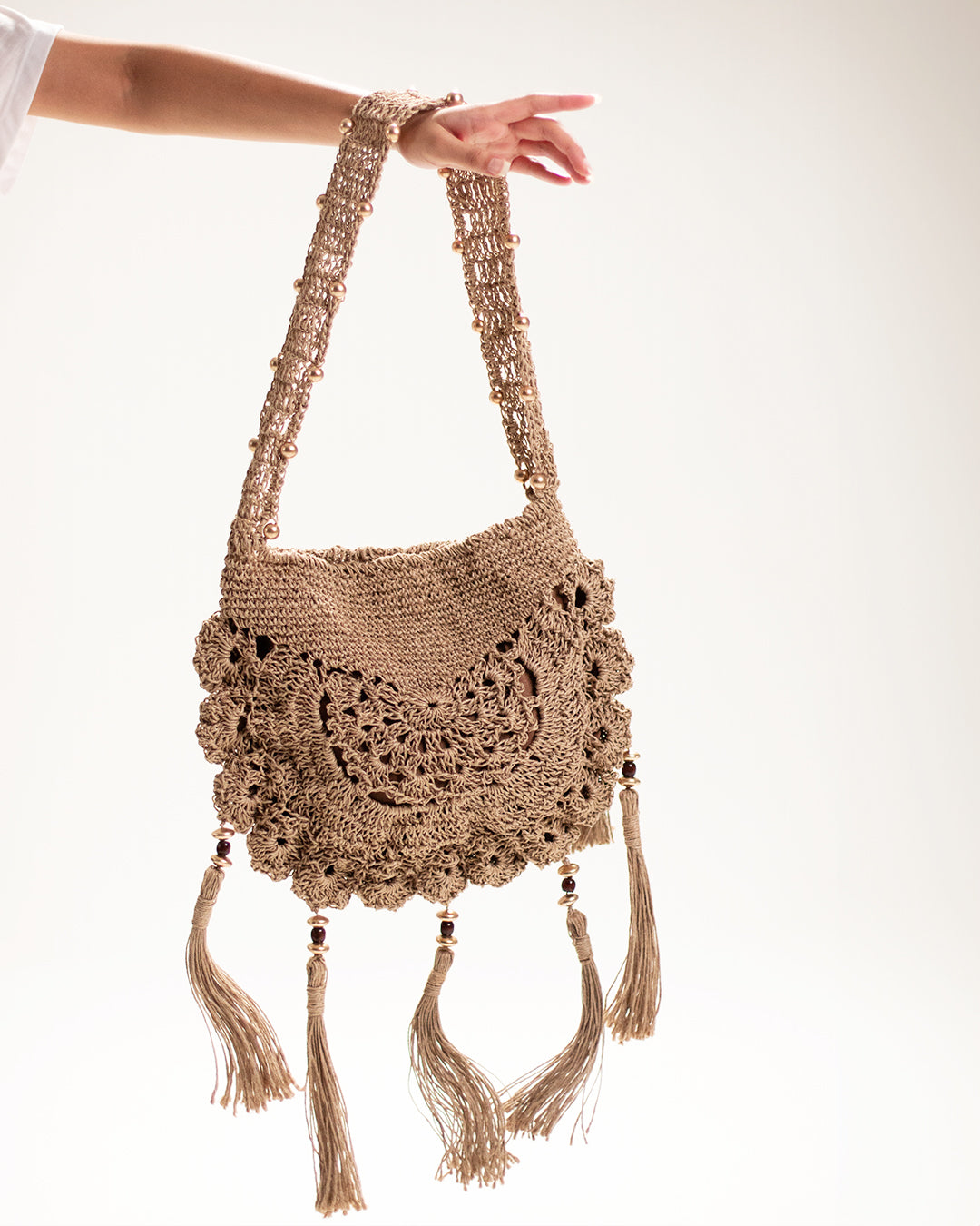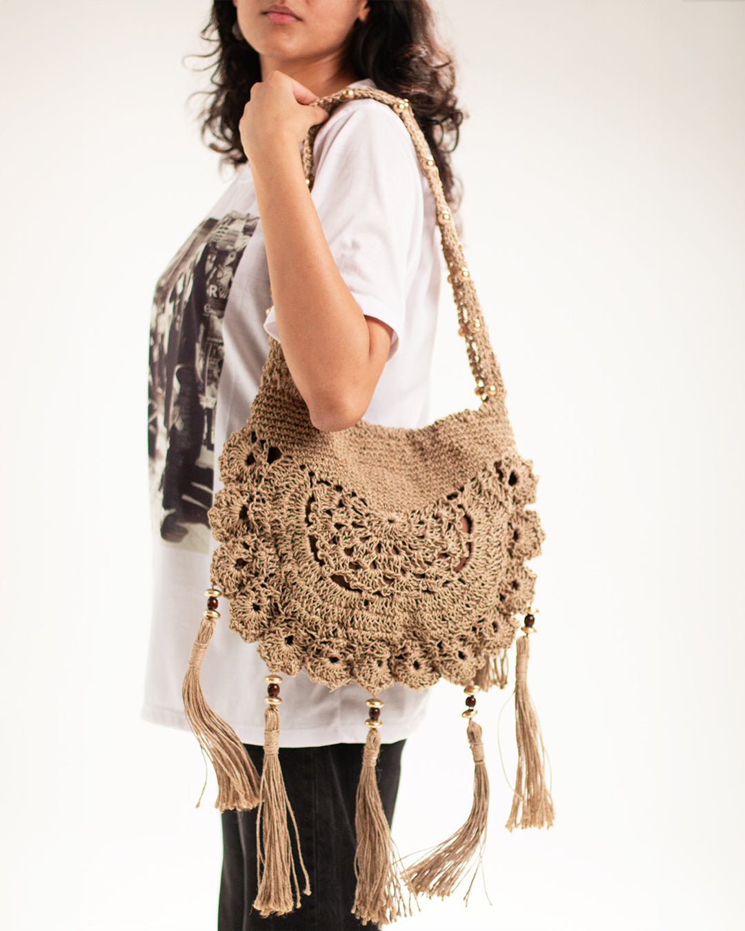 Introducing our handcrafted Peacock Boho crochet bag, the perfect beach accessory for the bohemian at heart. Made with stylish and beautiful jute thread, this bag not only adds a touch of flair to your beach ensemble but also helps you carry all your essentials in one stylish package. The intricate crochet work gives this bag a unique, artisanal look that is sure to turn heads. With a spacious interior and sturdy handles, it's the perfect blend of fashion and functionality. Add a pop of color and style to your beach look with our Peacock Boho crochet bag.