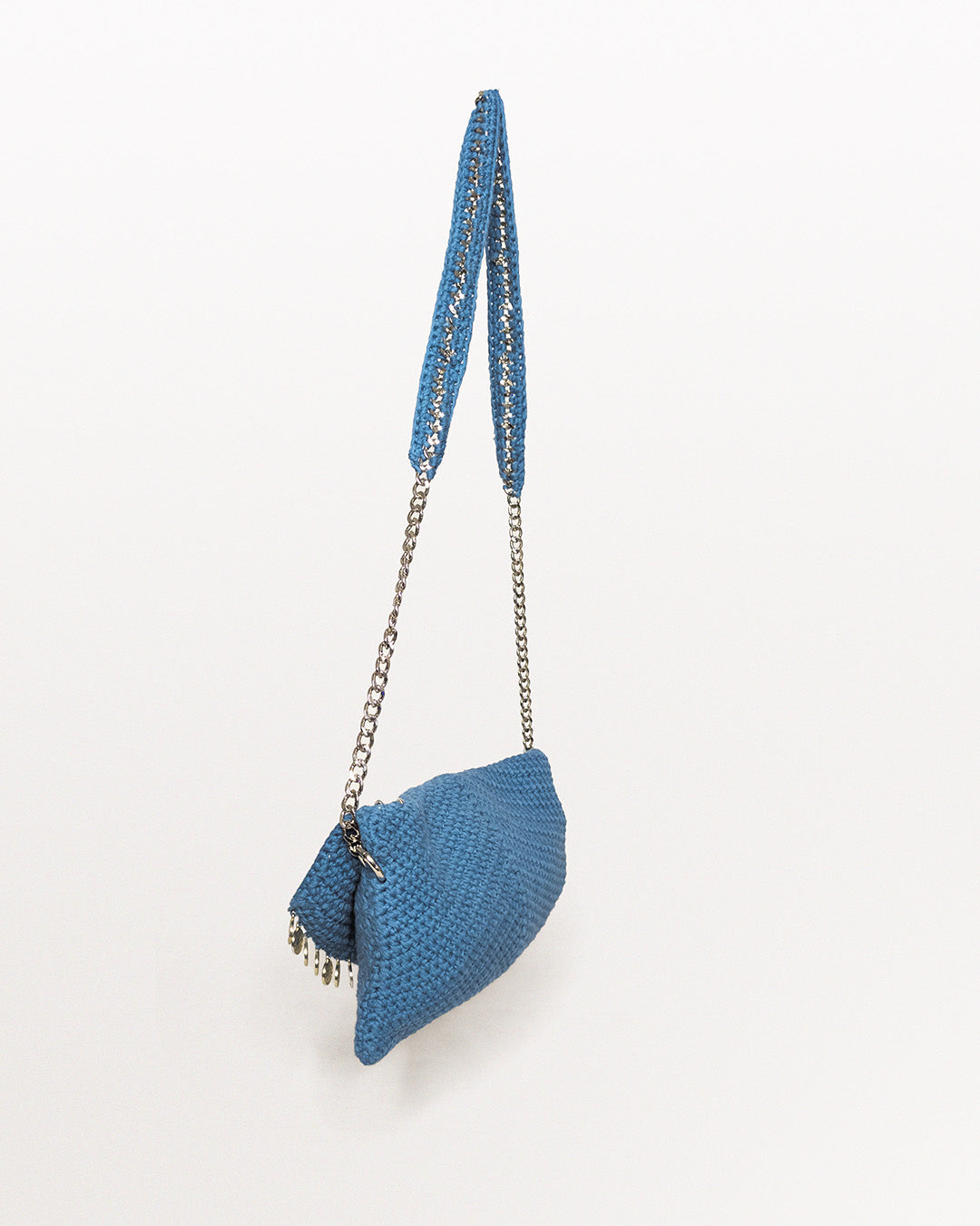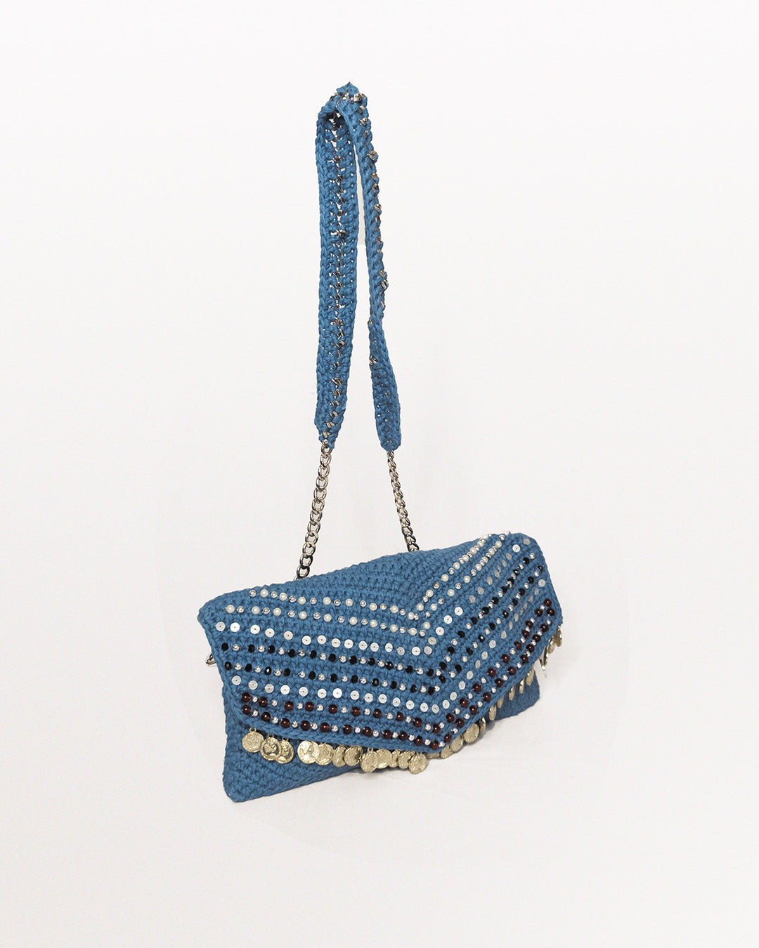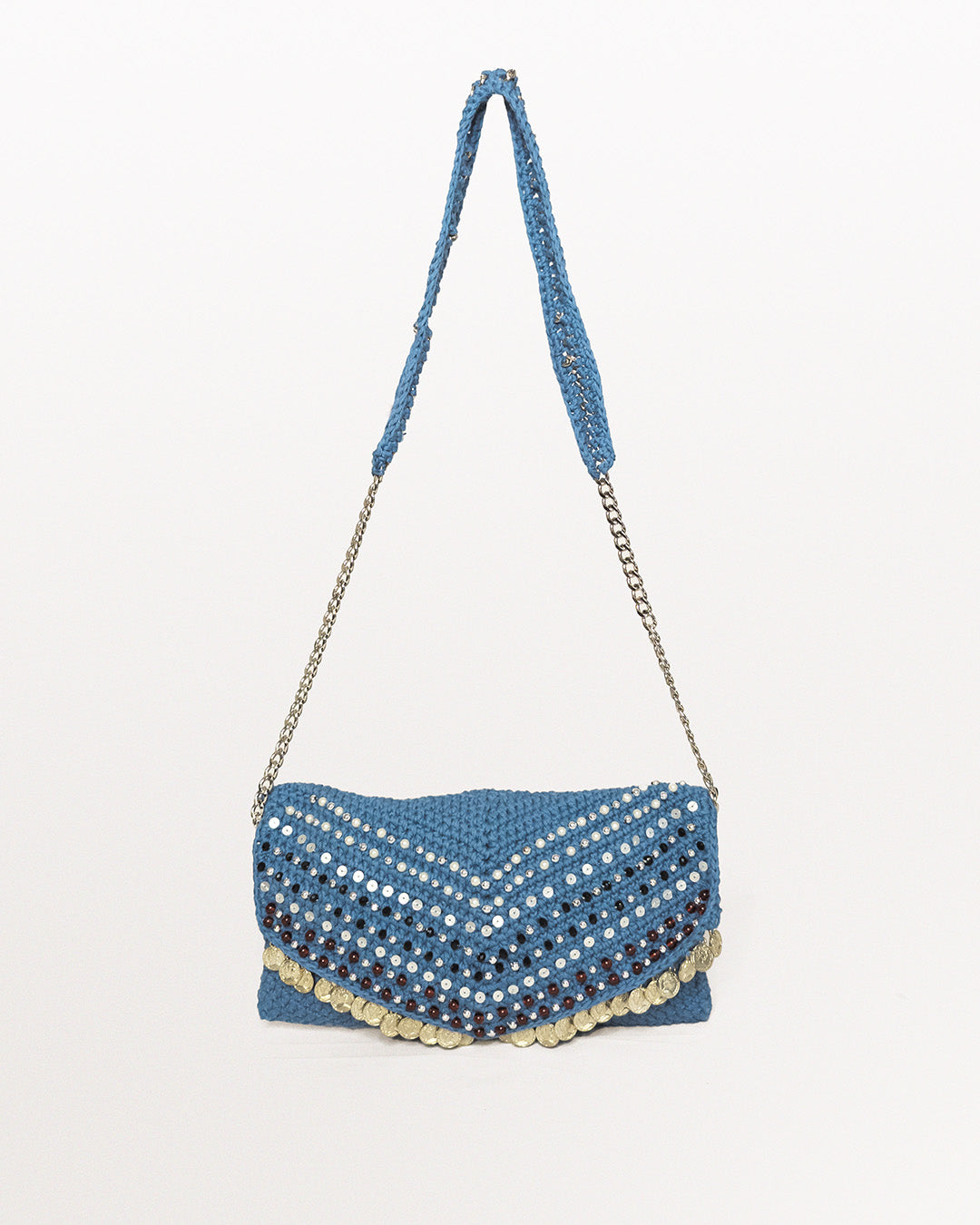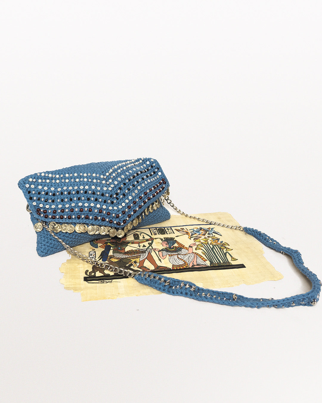 Inspired by Cleopatra's iconic style, this bag features intricate crochet patterns reminiscent of the intricate designs found on Egyptian artifacts. The rich, deep blue color evokes the mystique and majesty of the Nile River, while the bag's shape and size offer both style and functionality.