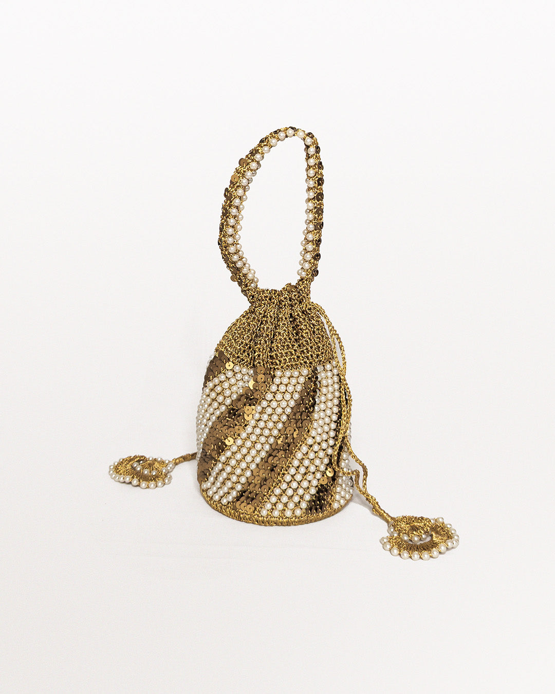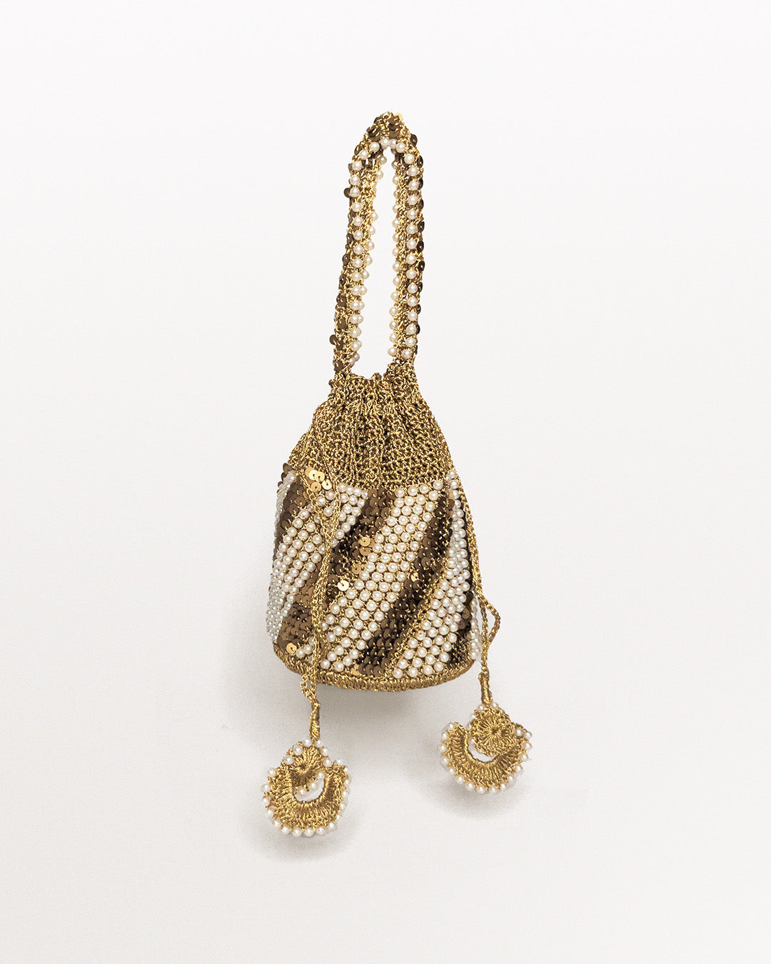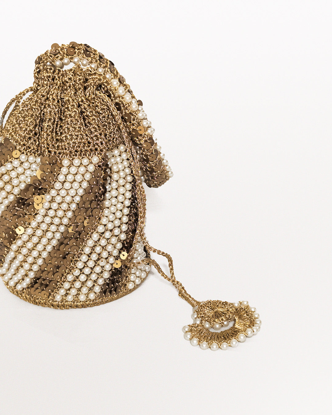 Introducing our exquisite Royal bag in gold featuring a hand-crafted twist inspired for wedding. This stunning potli is the perfect accessory for any royal affair, with its intricate detail and elegant design. The royal gold color adds a touch of sophistication and glamour to any outfit. Whether you're attending a wedding, gala, or formal event, the Royal bag Twister is the perfect choice to elevate your ensemble. Made with high-quality materials and impeccable craftsmanship, this potli is sure to make a statement at any event.